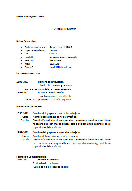Veja como fazer um curriculum vitae em pdf online de maneira simples. Escolha modelos de currículos em pdf para preencher e baixar. Descargar modelos de curriculum vitae en word y gratis (curriculo) nuestras plantillas de cv se destacan sobre otras porque son de alta calidad, gratis, se pueden editar de forma muy sencilla y están calificadas por los mejores especialistas y profesionales que entienden sobre el tema. Modelo de curriculum vitae básico para completar gratis. Maria julieta de la vega fernandez.